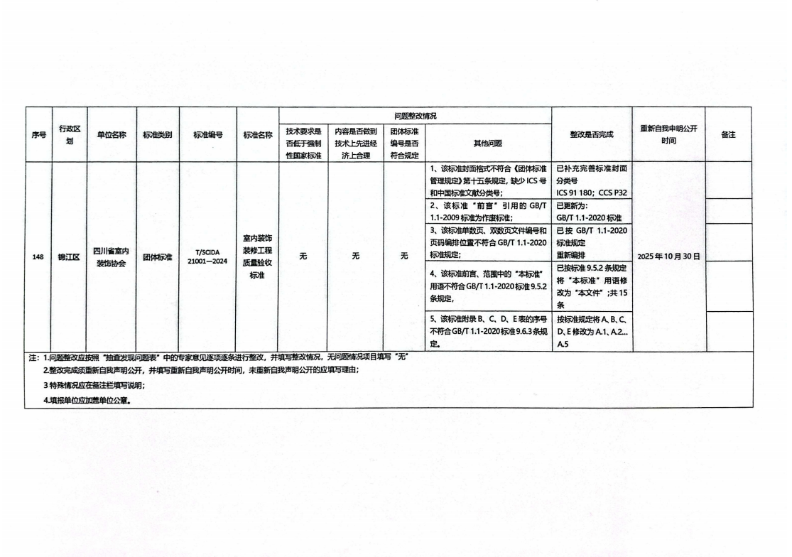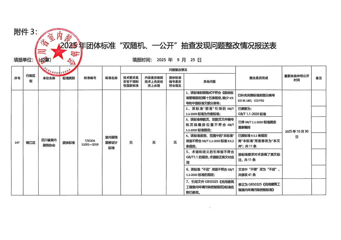 四川地方《室内装饰装修设计标准T/SCIDA 11001-2019》、《室内装饰装修工程质量验收标准T/SCIDA 21001-2024》发布实施至今已六年有余,为保障该项“标准”的科学合理原则、经济适用原则、适度前瞻性原则、可操作原则,为保持标准的科学性与先进性,为促进我省室内装饰行业设计、施工水平提高,促进室内装饰行业及企业标准化、规范化发展、保护消费者合法权益,为消费者提供品质优良、环保安全、美观舒适的“绿色”室内装饰空间,我会“标准委”按计划开展了对《室内装饰装修设计标准T/SCIDA 11001-2019》、《室内装饰装修工程质量验收标准T/SCIDA 21001-2024》的检查、修订工作并结合成都市标准化研究院对《室内装饰装修工程质量验收标准T/SCIDA 21001—2019》、《室内装饰装修工程质量验收标准T/SCIDA 21001-2024》的团体标准检查报告(设计标准报告编号:CDTB-2025-0182 施工标准报告编号:CDTB-2025-0183)内容,组织协会“标准委”研究后进行修订及完善,目前该项工作已完成,具体修订情况见《2025年团体标准“双随机、一公开”抽查发现问题整改情况报送表》。